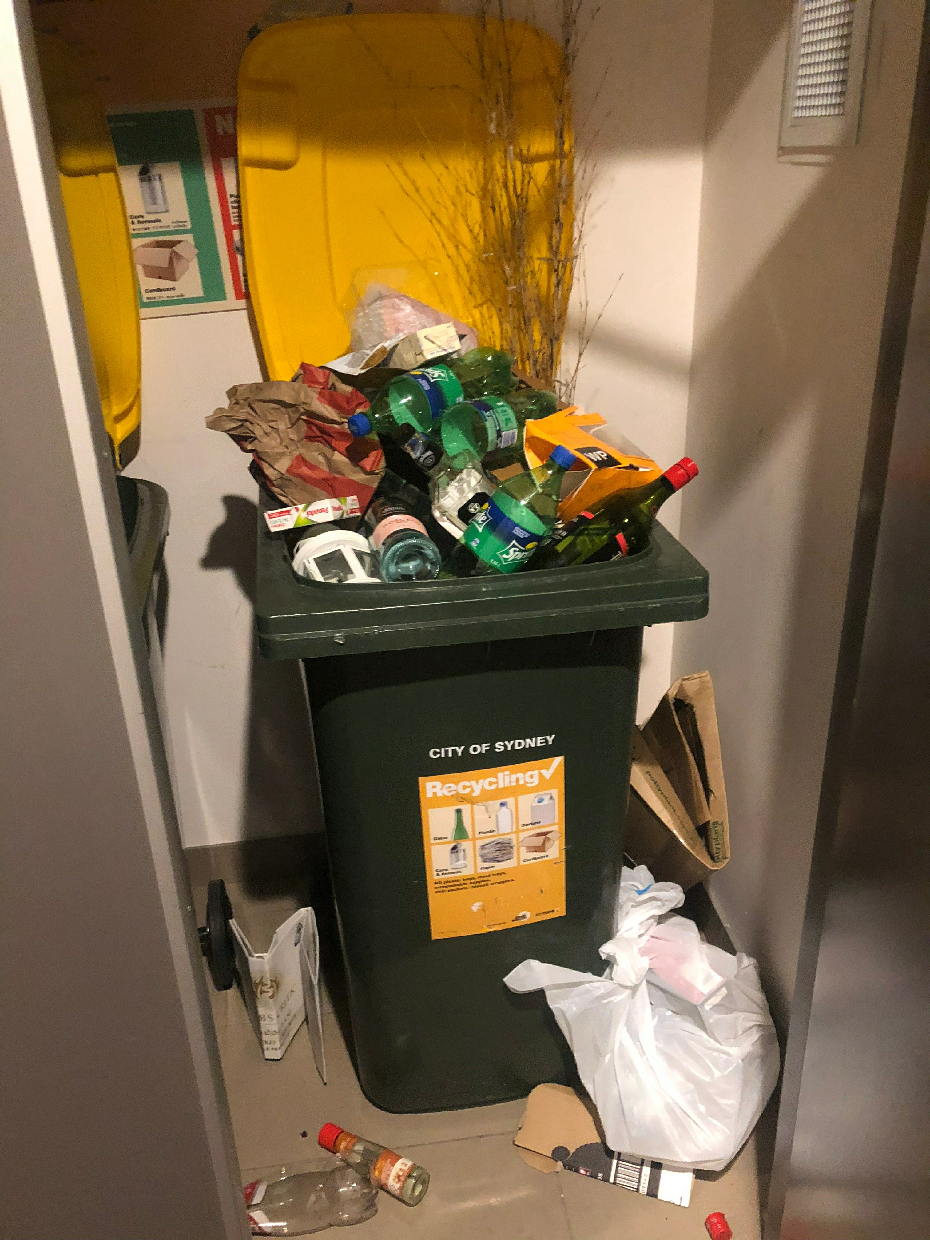 Each floor in Sydney’s apartment building is generally equipped with a chute to collect household waste and a public space to collect recyclable waste. Picture shown as below is the recycle waste bin in building I live. It can be seen from the figure that the trash can has been piled up, but it has not been cleaned up in time, and the garbage has spilled onto the floor.